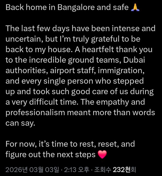 신두는 3일 사회관계망서비스 X를 통해 "집이 있는 벵갈로르에 무사히 돌아왔다"며 "지난 며칠은 매우 불확실한 시간이었지만, 다시 집으로 돌아올 수 있어 진심으로 감사한 마음"이라고 했다.