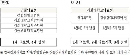 다만 강동경희대학교 치과·한방병원은 강동경희대학교병원 산하 수련병원 지위와 교육 체계를 그대로 유지한다.