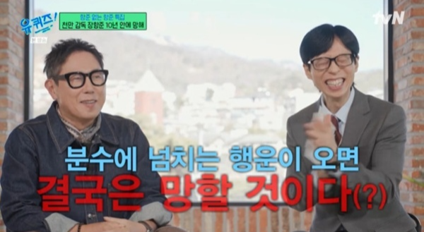 윤종신은 “첫 번째로는 꾸준히 뭔가를 열심히 하면 기회가 온다는 것”이라고 했고, 이어 “두 번째는 분수에 넘치는 행운이 오면 결국은 망할 것”이라며 “아마 10년 안에 올 거다. 장항준 감독이 가진 능력에 비해 넘치는 뭔가가 왔다. 이 정도 사이즈는 아닌데”라고 말해 웃음을 자아냈다.