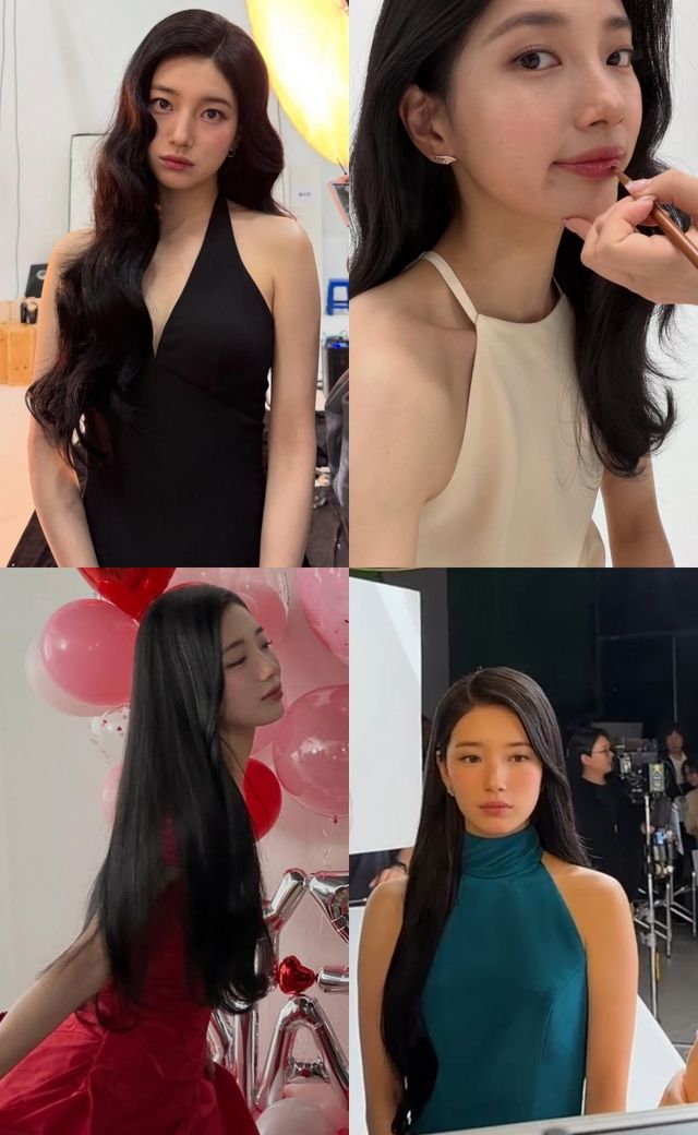 수지는 5일 자신의 소셜미디어(SNS)를 통해 광고 촬영장 비하인드 사진 여러 장을 공개했다.