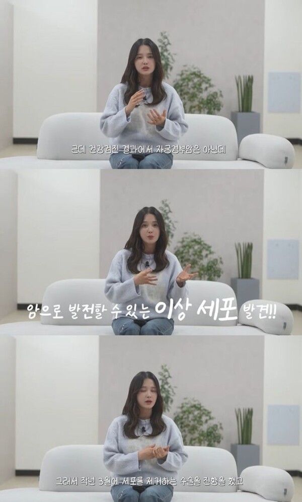 영상에서 남보라는 결혼 전 건강검진을 받았는데 자궁경부암은 아니지만 암을 유발할 수 있는 이상 세포가 발견되어 급하게 수술을 받게 됐다고 밝혔다. 이어 지난해 3월 해당 세포를 제거하는 수술을 진행했으며 상처가 완벽하게 아무는 데까지 약 두 달의 회복 시간이 필요했다고 덧붙였다.