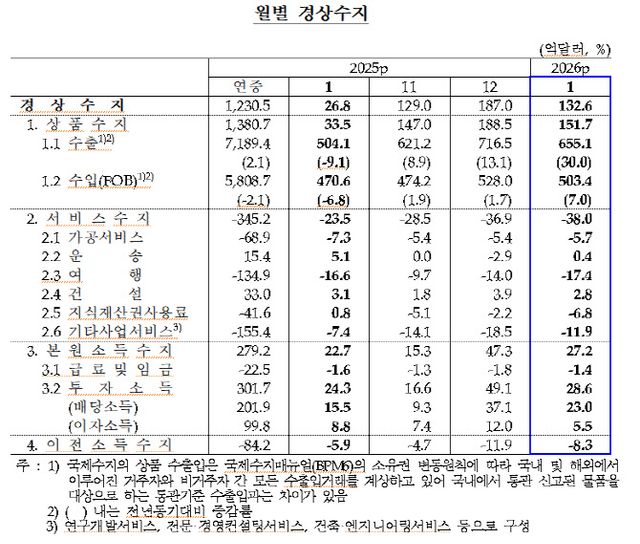 6일 한국은행이 발표한 ‘2026년 1월 국제수지(잠정)’에 따르면 우리나라 경상수지는 132억 6000만달러 흑자를 기록했다. 2000년대 들어 두 번째로 긴 33개월 연속 흑자이자, 흑자 규모로는 역대 5위를 기록했다. 다만, 지난해 사상 최대였던 12월(187억달러)보다는 흑자 폭이 54억 4000만달러 줄었다.