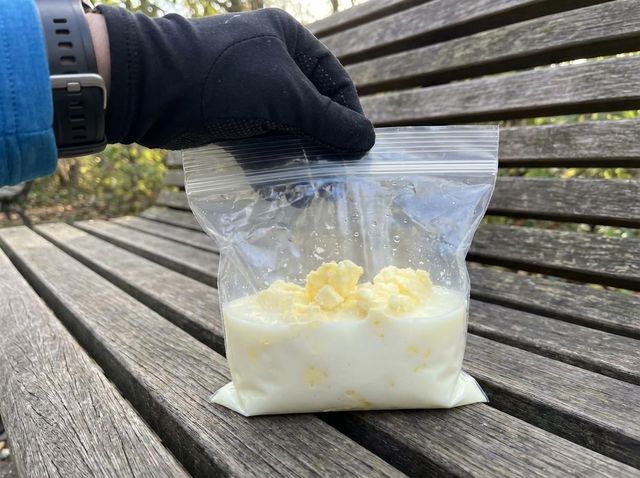 달리기가 끝난 뒤 지퍼백을 열어 보면 고체 버터와 액체 상태의 버터밀크가 분리된 것을 확인할 수 있다. 일부 러너들은 여기에 소금이나 꿀을 약간 넣어 간단한 버터를 만들어 먹는 방식으로 챌린지를 마무리한다.