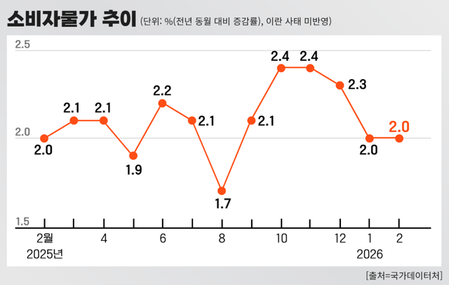 현재 소비자물가 상승률은 2% 수준을 유지하고 있지만 이미 생활물가 곳곳에서는 상승 압력이 나타나고 있다는 점도 우려가 제기되는 배경이다. 돼지고기와 쇠고기, 달걀, 고등어 등 주요 식재료 가격이 여전히 높은 수준을 유지하고 있다. 보험료, 공동주택 관리비, 해외여행비 등 서비스 가격도 큰 폭으로 상승했다. 특히 승용차 임차료는 통계 작성 이후 최대 폭으로 상승하며 개인 서비스 물가 상승을 견인했다.