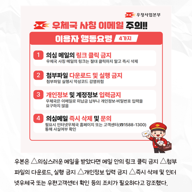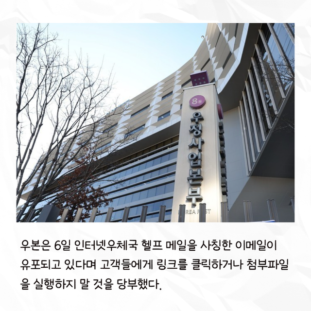 [프라임경제] 과학기술정보통신부 우정사업본부(이하 우본)는 6일 인터넷우체국 헬프 메일을 사칭한 이메일이 유포되고 있다며 고객들에게 링크를 클릭하거나 첨부파일을 실행하지 말 것을 당부했다.
