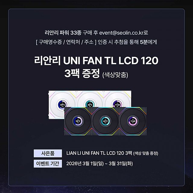 LIAN LI is running a March giveaway for power supply buyers in Korea, with five winners set to receive a UNI FAN TL LCD 120 3-pack package matched to the color of the purchased power supply.