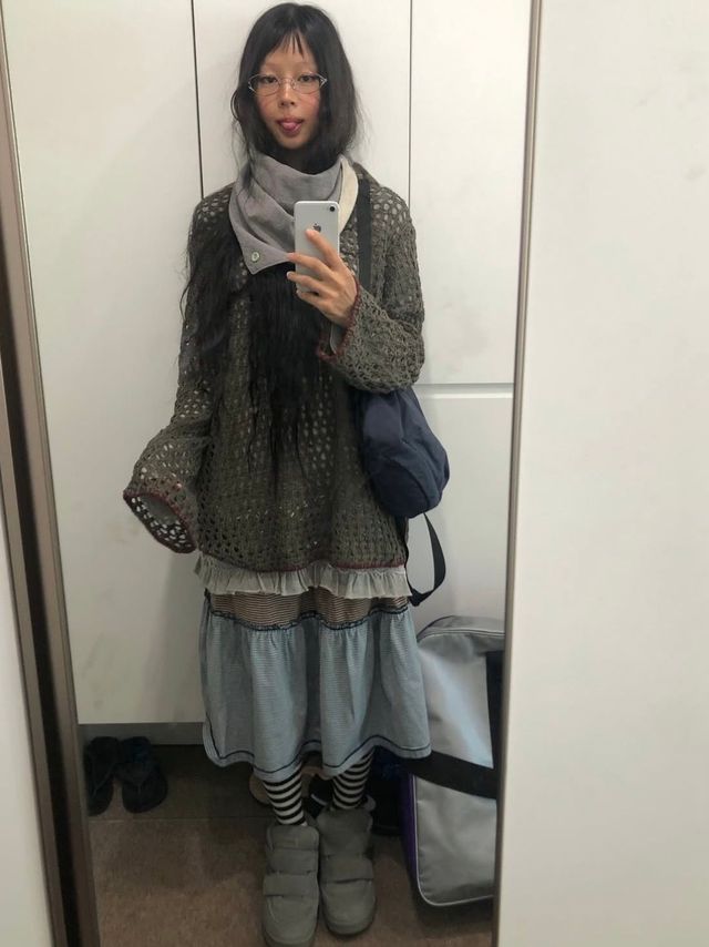 」MZ 세대 사이에서 주목받는 모델 서지수는 코티지코어를 보다 입체적으로 잘 살립니다. 원피스 하나만 입는 데서 그치지 않고 그 위에 팬츠를 레이어드하거나, 슬리브리스와 니트, 다양한 소재를 겹쳐 입으며 색다른 조합을 만들어내죠.