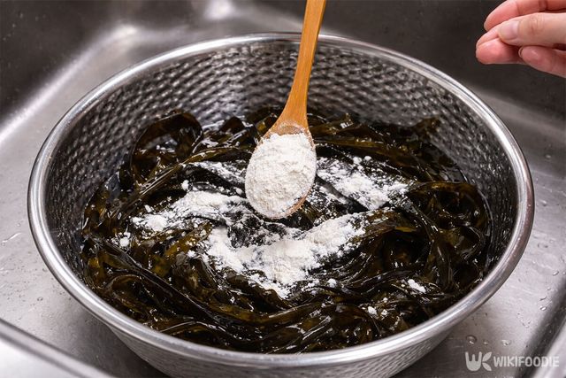 물미역에는 미끈한 점액과 불순물이 붙어 있다. 그대로 씻으면 잘 떨어지지 않는다. 이때 밀가루 한 스푼을 넣어 조물조물 주물러 씻으면 표면에 붙은 이물질이 쉽게 떨어진다.