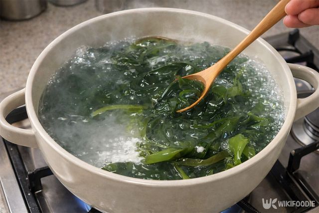 3. 물이 끓으면 불을 끄고 찬물 1컵을 넣어 온도를 낮춘 뒤 물미역을 넣고 약 10초 데친다