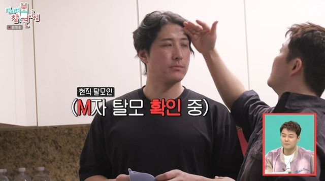 전현무는 “M자가 후퇴하면서 정수리로 만나거든”이라며 황재균의 머리를 직접 확인했고, “M자 (탈모) 왔네”라고 진단했다. 이어 전현무는 “스튜디오에 사람들 있어서 창피할까봐 말 안 했는데, 만나면 얘기해주려고 했다. 결국 다 보게 되겠지만”이라며 “그냥 그때 얘기하는 게 나을 뻔했다”라고 밝혔다. 또한 “탈모 초기인 분들이 자주하는 분들이 저런 머리다. 웨이브로 가리려고”라고 덧붙였다.