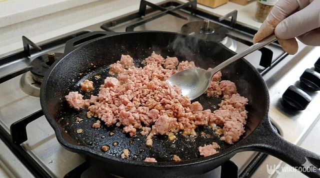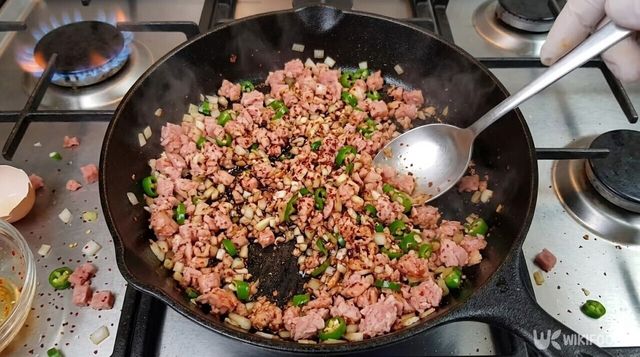 팬을 중불에 올리고 식용유를 두르지 않은 상태에서 으깬 스팸을 먼저 넣는다. 스팸 자체에 지방이 많기 때문에 기름을 따로 넣으면 요리가 지나치게 느끼해질 수 있다. 주걱으로 뭉쳐있는 스팸을 꾹꾹 눌러가며 낱알이 하나하나 떨어지도록 볶다 보면, 스팸에서 맑은 기름이 나오며 고소한 향이 올라오기 시작한다.