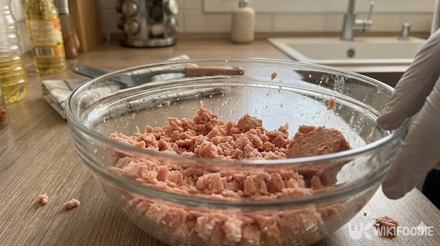 1. 스팸은 겉면 기름기를 닦고 손으로 형태가 남지 않게 잘게 으깬다.