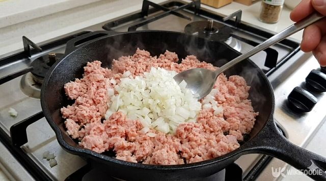 스팸에서 기름이 충분히 나오면 팬 가운데에 동그란 공간을 만든 뒤 다진 양파를 넣는다. 양파를 곧장 섞지 않고 잠시 기다리면 수증기가 올라오며 수분이 증발하는데, 이때부터 스팸과 섞어가며 본격적으로 볶는다. 수분을 충분히 날려주는 것이 이번 요리의 비결이다. 고슬고슬한 볶음밥 같은 느낌이 들 때까지 바닥이 타지 않게 잘 긁어가며 볶아준다.