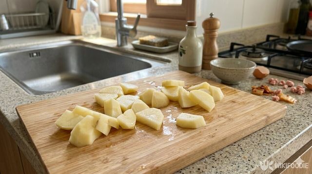 껍질을 벗긴 감자 3개는 반으로 가른 뒤, 약 1cm 내외의 두께로 큼직하게 썰어준다. 너무 얇으면 조리는 과정에서 부서지기 쉽고, 너무 두꺼우면 속까지 간이 배는 데 오래 걸리므로 적당한 두께를 유지하는 것이 좋다.