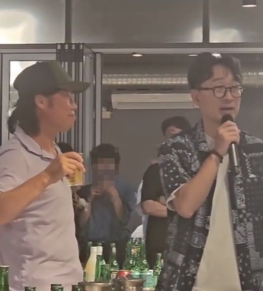 한 스태프가 자신의 계정에 올린 영상으로, 장항준 감독과 주연 배우 유해진이 자리에서 일어나 쫑파티 현장의 흥을 돋우고 있다.
