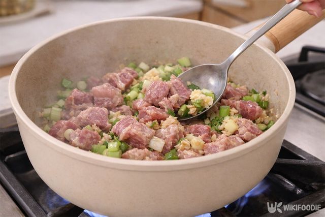2. 돼지고기 300g을 넣고 고기 겉면이 하얗게 익을 때까지 볶는다.