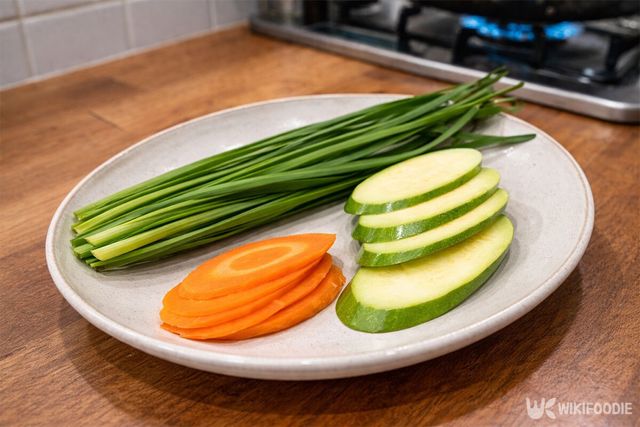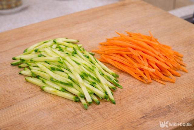 2. 애호박과 당근은 가늘게 채 썰고, 부추는 6cm 길이로 자른다.