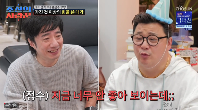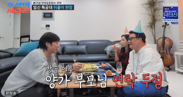 9일 방송된 TV조선 예능 ‘조선의 사랑꾼’에서는 배기성 부부가 윤정수 부부와 모임을 가졌다.
