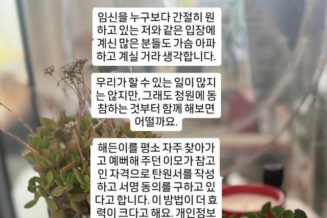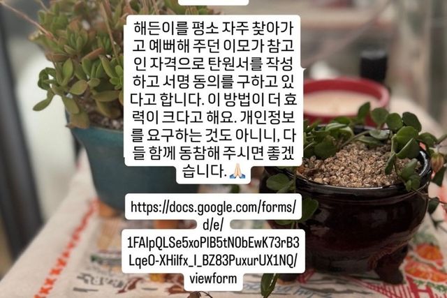 이어 구글 설문조사 링크를 첨부하며 “해든이(가명)를 평소 자주 찾아가고 예뻐해 주던 이모가 참고인 자격으로 탄원서를 작성하고 서명 동의를 구하고 있다고 한다”라며 “이 방법이 더 효력이 크다. 어른들도 가만히 있을 수 없다”라고 전달하며 목소리를 높였다.