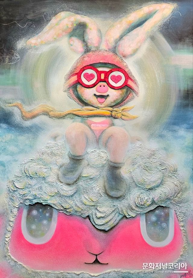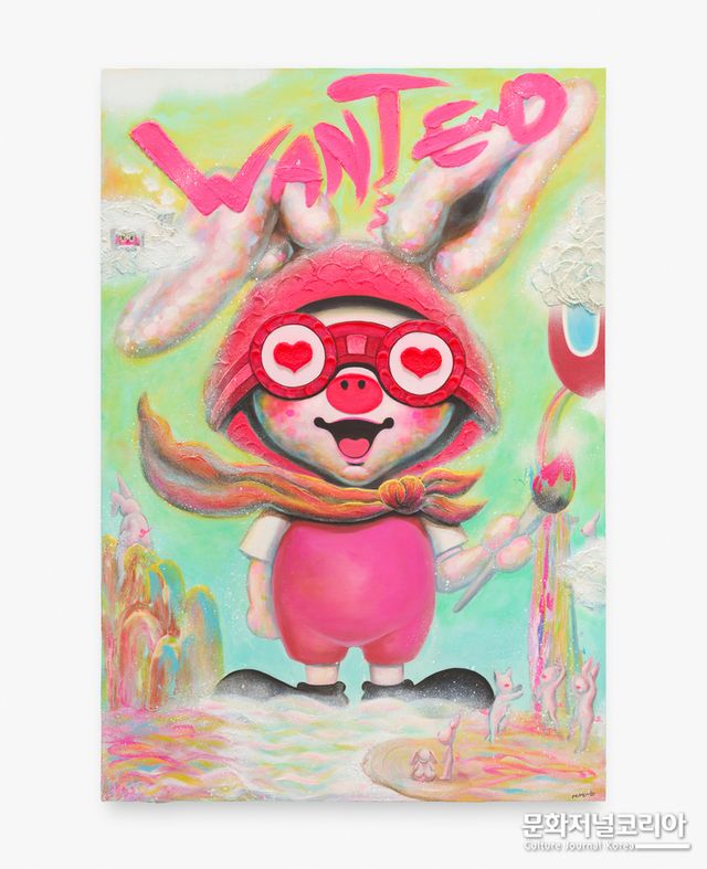 작가는 캐릭터를 단순한 장식적 요소가 아닌 하나의 상징적 존재로 활용한다. 작품 속 캐릭터는 현대인의 감정을 대변하는 또 다른 자아이자, 개인의 내면과 사회적 감정이 교차하는 지점에서 등장하는 서사적 장치다. 이러한 캐릭터적 세계는 대중문화의 이미지와 현대미술의 회화적 실험이 결합된 네오팝의 확장된 가능성을 보여준다.