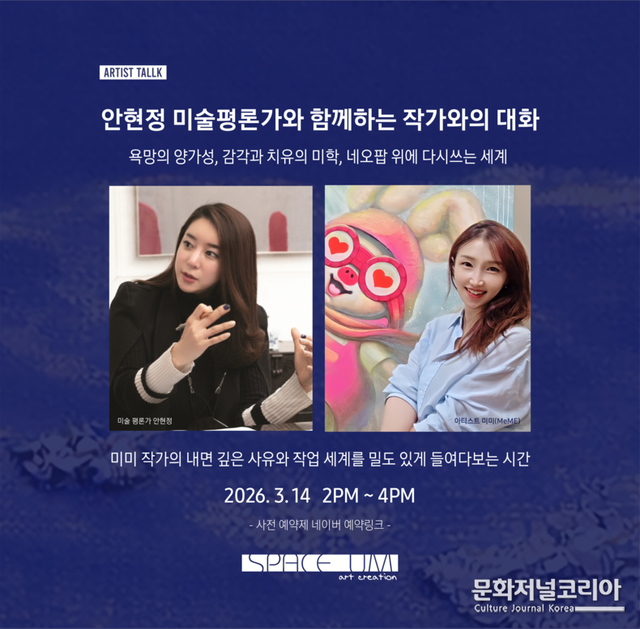 이번 토크는 같은 날 개막하는 미미(MeME) 개인전 'WANTED'의 핵심 프로그램으로 진행된다. 전시는 3월 14일부터 4월 1일까지 스페이스엄 갤러리에서 이어지며, 미미 작가의 최근 작업을 중심으로 네오팝적 감각이 돋보이는 작품들을 선보인다.