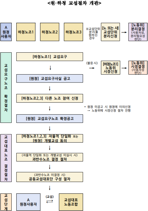 노사관계에 큰 변화가 예상되는 법인만큼 주무부처인 고용노동부도 바쁘게 움직였다. 특히 논란이 많은 원하청 교섭 절차를 다듬기 위해 노조법 시행령을 개정하고, <개정 노동조합법 해석지침>, <원하청 상생 교섭절차 매뉴얼>을 만들었다. 관련 내용을 정리했다.