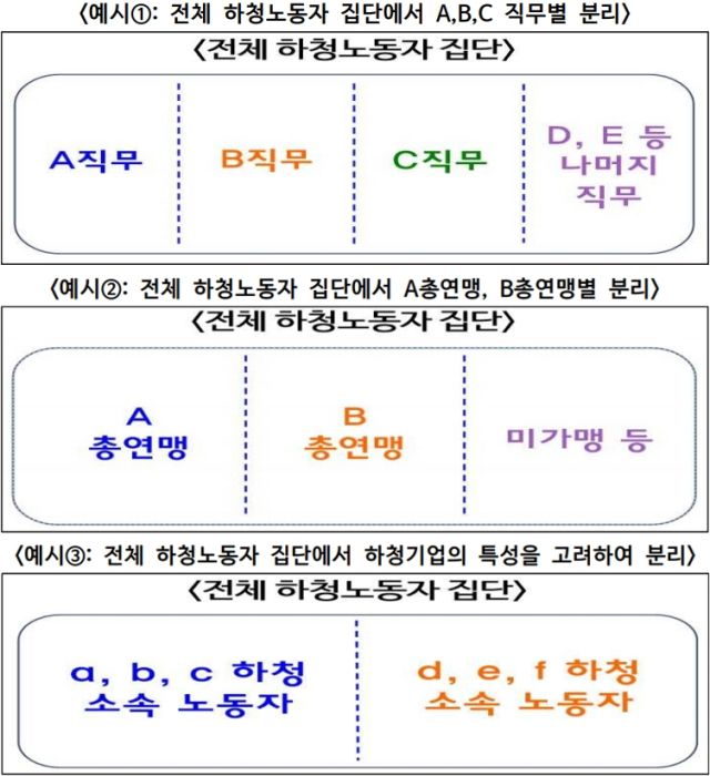 예컨대, 하청 노동자의 직무가 청소, 경비 등으로 다르면 교섭단위가 분리될 가능성이 높다. 매뉴얼에서 노동부는 민주노총, 한국노총 등으로 하청 노동자가 속한 상급단체가 다른 경우도 '특별한 사정'이 있다고 인정해 교섭단위를 분리하겠다고 밝혔다.