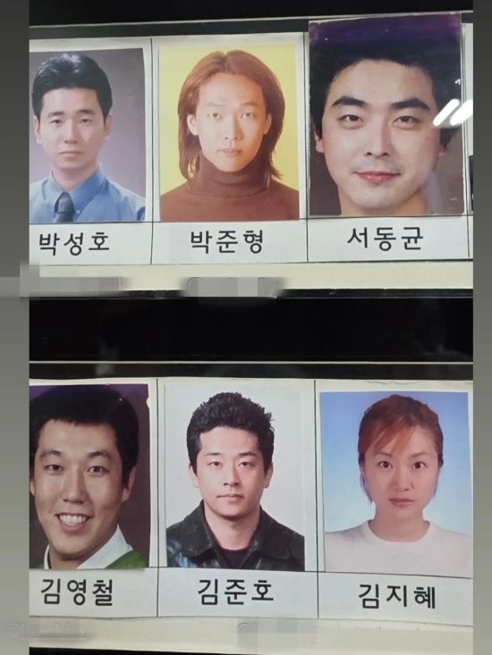 KBS 희극인실에 있는 13기, 14기 공채 개그맨, 개그우먼들의 명단과 증명사진을 찍은 모습. 선후배에서 부부로 인연을 맺은 박준형과 김지혜의 풋풋한 옛 시절이 시선을 사로잡는다.