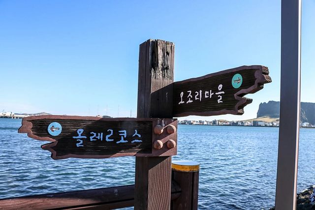 오조포구를 찾았다면 인근 식산봉도 함께 둘러볼 만하다. 높지 않은 언덕이라 큰 부담 없이 오를 수 있지만, 정상에 서면 포구와 성산일출봉, 마을과 바다가 어우러진 풍경이 한눈에 들어온다. 아래에서 보던 풍경과 달리 지형의 흐름이 보다 입체적으로 읽히고, 오조리 일대가 지닌 조용한 매력이 더욱 또렷하게 다가온다.