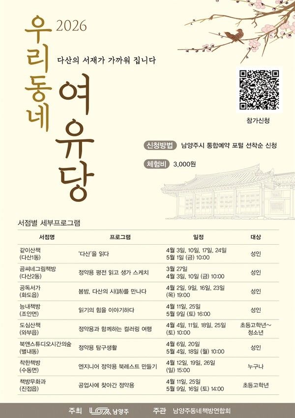 시는 관내 동네책방 8곳을 거점으로 '우리동네 여유당' 프로그램을 오는 27일부터 운영한다고 10일 밝혔다. 지역 문화공간을 활성화하고 시민들이 일상 속에서 정약용의 철학과 가치를 자연스럽게 접하도록 기획된 사업이다.