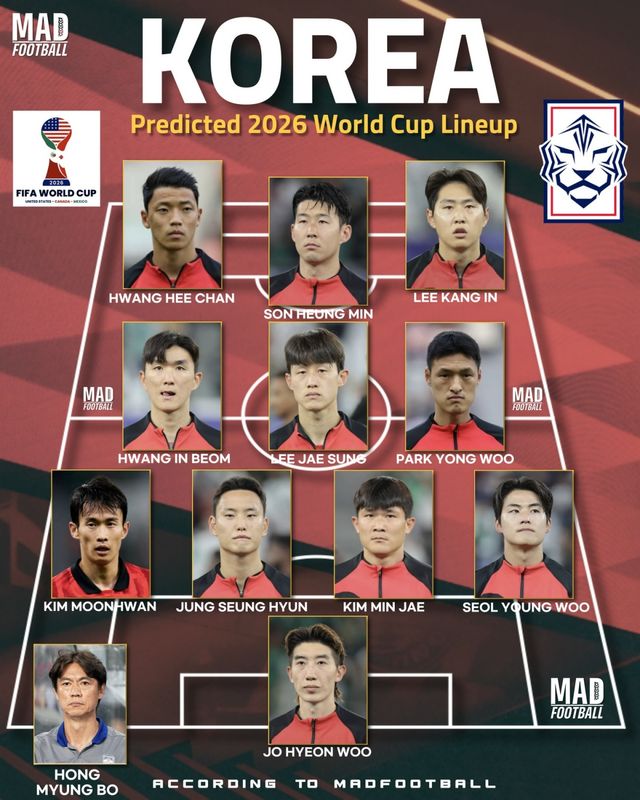 글로벌 축구 콘텐츠 매체 '매드풋볼'은 10일(한국시간) 2026 북중미 월드컵에서 좋은 성적을 거둘 상위 18개 팀의 예상 선발 라인업을 전망했는데 여기에 대한민국이 포함됐다. 딱 16팀을 찍은 것은 아니지만 18강 안에 들었다는 것에 의미가 있다.