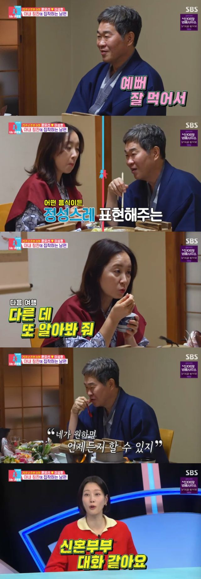 이성호는 음식을 맛있게 먹는 윤유선의 모습을 바라보면서 "잘 먹어서 예쁘다. 예쁘고 사랑스러운 순간이 많지만, 어떤 음식이든 장점을 찾아서 얘기해주는게 좋더라"고 했다.