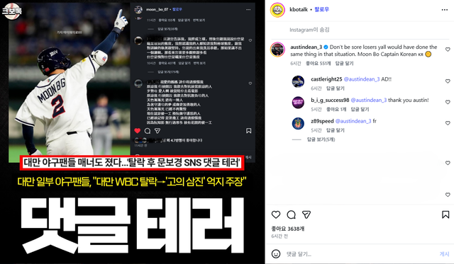 대만 매체 'CTI 뉴스'는 지난 10일(한국시간) "한국과 호주의 WBC 경기에서 문보경이 루킹 삼진을 당한 장면이 논란이 됐다"고 보도했다.
