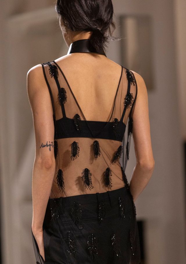 컬렉션의 색채는 전반적으로 모노크롬 팔레트였다. 블랙, 화이트, 베이지. 카키 코트와 레드 슬립 드레스를 비롯해 몇 가지 컬러 포인트가 등장하긴 했다. 하지만 중심은 실루엣과 소재였다. 남성과 여성 모델에게 거의 동일한 테일러드 수트를 반복적으로 입힌 것도 인상적이다. 동일한 디자인을 공유했고 실루엣과 비율만 미묘하게 달랐다. 옷을 우리의 감정, 욕망과 함께하는 존재로 바라보지, 특정한 정체성의 상징으로 여기지 않는 키우리의 관점은 여전했다. 컬렉션의 또 다른 중심에는 드레스들이 있었다. 잉크처럼 깊은 실크와 발레 슈즈를 연상시키는 누드 톤 시스루 소재. 그리고 몸의 선을 자연스럽게 따라가는 실루엣. 드레스들은 몸의 움직임이 디테일로 변모했다. 말하자면 이번 컬렉션은 몸을 통제하거나 억지로 변형시키지 않는다. 오히려 몸 자체의 움직임과 감각으로 돌아간다.
