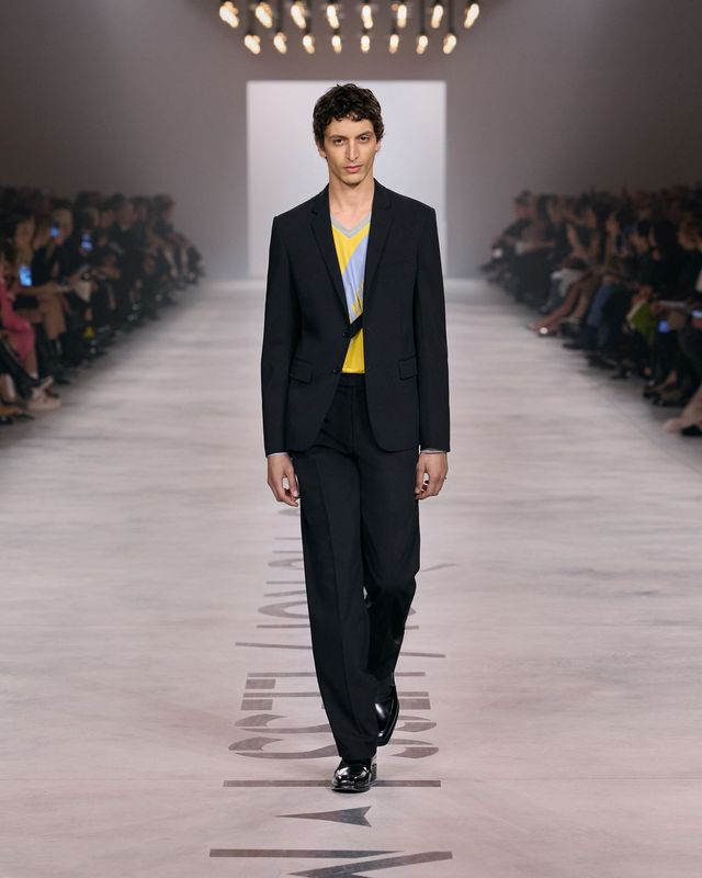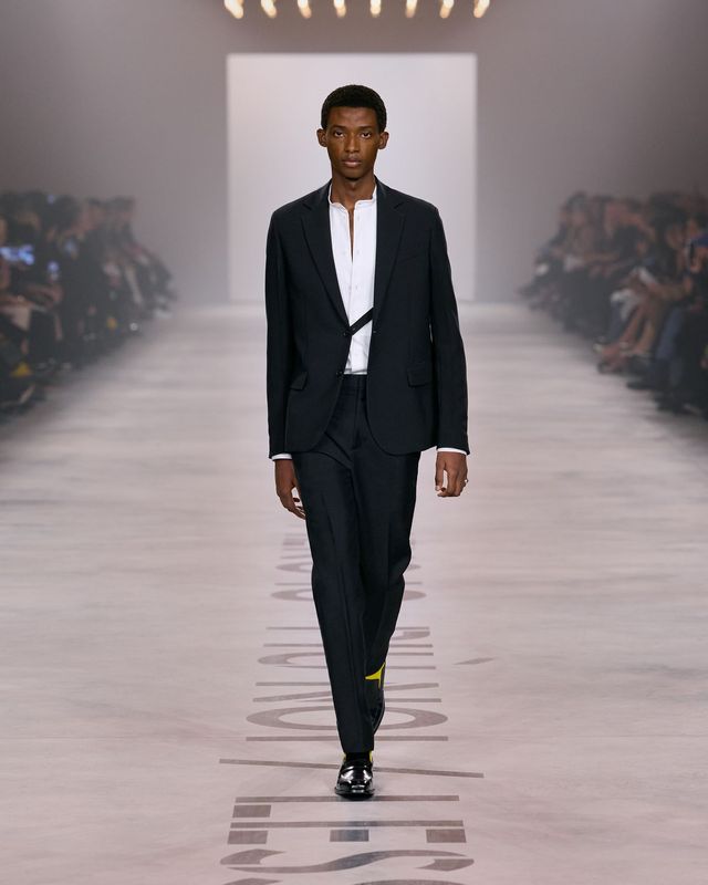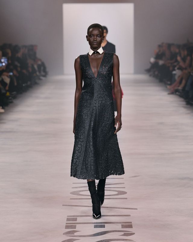 이런 배경 속에서 키우리의 복귀 신고식과 다름없는 컬렉션은 놀라울 만큼 절제된 방식으로 전개됐다. 최근 몇 시즌 동안 런웨이가 점점 더 극적인 이미지와 디지털 소비를 겨냥한 장면에 집착했다. 그에 비하면 키우리의 접근은 의도적으로 차분해 보였다. 런웨이에 적힌 슬로건 “Less I, more us”은 또 하나의 오래된 문장을 불러냈다. “Less is more.” 쇼의 첫 룩은 놀라울 만큼 절제된 올 블랙 실루엣이었다. 깊게 열린 브이넥 드레스는 재킷의 구조를 닮은 테일러링으로 완성됐다. 장식은 거의 배제됐다. 블랙 양말과 힐 그리고 바게트 백. 그 조합만으로도 이번 컬렉션의 방향은 충분히 짐작됐다.