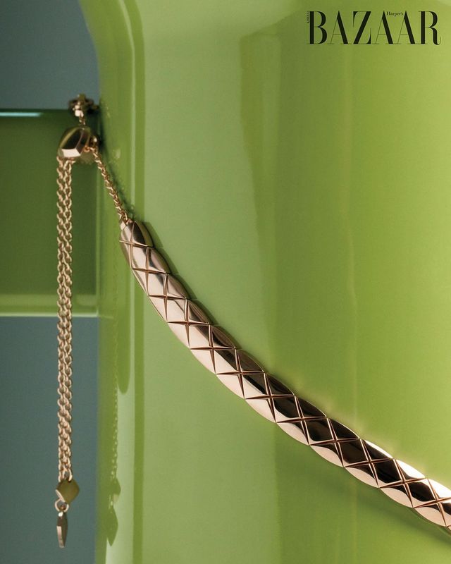 베이지 골드 라지 네크리스, 다이아몬드를 세팅한 베이지 골드 링, 오른팔의 다이아몬드를 장식한 베이지 골드 브레이슬릿, 레이어드한 베이지 골드 브레이슬릿, 왼팔의 화이트 골드 브레이슬릿은 모두 ‘코코 크러쉬’ 컬렉션 Chanel Fine Jewelry.