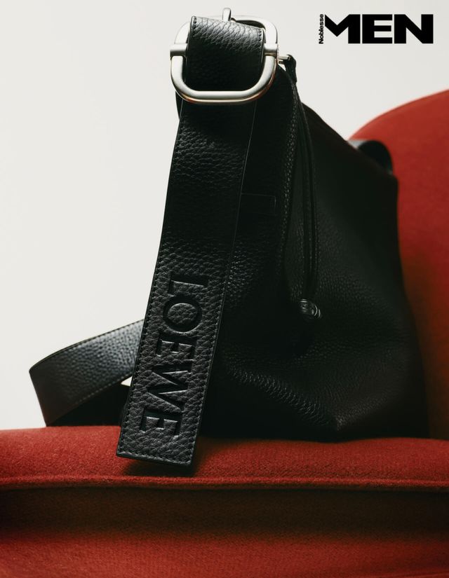 투박하고 입체적인 가죽의 질감, 과하게 다듬지 않은 가죽 표면의 특성을 고스란히 살렸다. 로고를 음각하고 큼직한 버클을 단 스트랩도 가방의 멋을 배가한다. 가볍고 유연한 데다 무던한 디자인 덕에 일상에서 편하게 들기 좋다. 원뿔 기둥에 올려둔 빨간색 의자 Porro by YOU AND US.