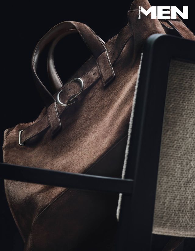 손잡이는 매끈하게 가공한 가죽으로 형태를 또렷이 잡고, 몸체는 부드러운 스웨이드로 만들어 자연스러운 실루엣과 질감의 대비를 살렸다. 가방 자체가 유연해 사용자의 일상에 맞춰 형태가 변한다는 점도 특징. 밑에는 단단한 가죽을 덧대 바닥에 내려놓았을 때 쉽게 무너지지 않도록 설계했다. 라운지 체어 Rolf Benz by YOU AND US.