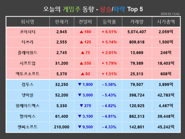 반면, 컴투스는 금일(11일) 전거래일 대비 5.56%(1,900원) 하락한 32,250원에 장을 마감했다. 개인이 50,744주를 순매수한 반면, 기관과 외국인이 각각 27,720주, 23,252주를 순매도하며 장 초반부터 하락해 약세로 마쳤다. 컴투스의 주가 하락은 가격부담이 상승한 데 대한 반응으로 분석된다. 실제로 컴투스의 주가는 구글의 앱수수료 인하 기대감에 힘입어 지난 5일부터 3거래일 연속 상승했다. 이에 가격부담이 커졌고 투자자 차익실현이 현실화되면서 주가가 하락한 것으로 보인다.
