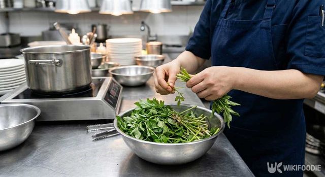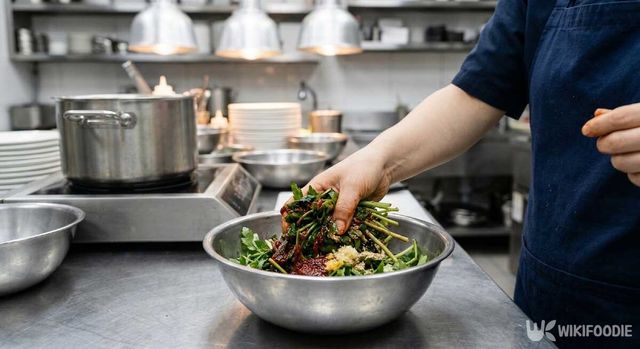 준비한 어수리나물을 넣고 손으로 가볍게 버무린다. 나물을 세게 누르듯이 무치면 식감이 떨어질 수 있어 살살 섞는 것이 좋다. 마지막에 간을 보고 싱거우면 소금을 약간 더한다.