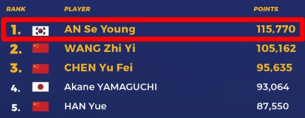 왕즈이는 무려 11번의 도전 끝에 안세영 상대로 승리를 맛봤지만, 그동안 안세영이 국제대회를 휩쓸고 다니면서 벌어들인 랭킹포인트를 넘는 건 역부족이었다.