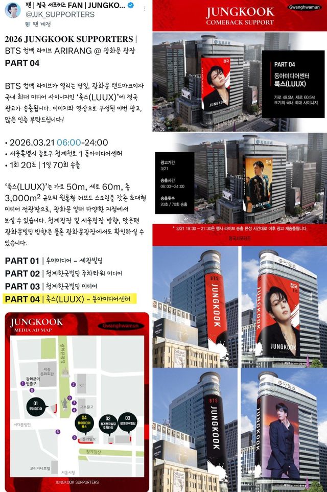 국내 팬클럽 ‘정국 서포터즈’는 3월 21일 서울 광화문에서 열리는 방탄소년단 컴백 공연을 기념해 정국을 위한 대규모 응원 광고를 준비했다고 밝혔다. 팬들은 X(엑스, 구 트위터)를 통해 광화문 랜드마크인 초대형 미디어 사이니지 ‘룩스(LUUX)’ 전광판에서 정국 컴백 응원 광고를 송출한다고 공개했다.