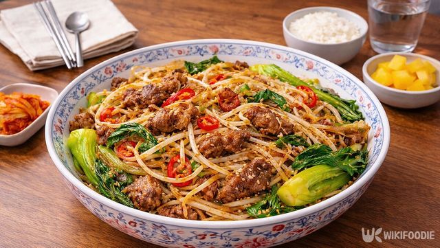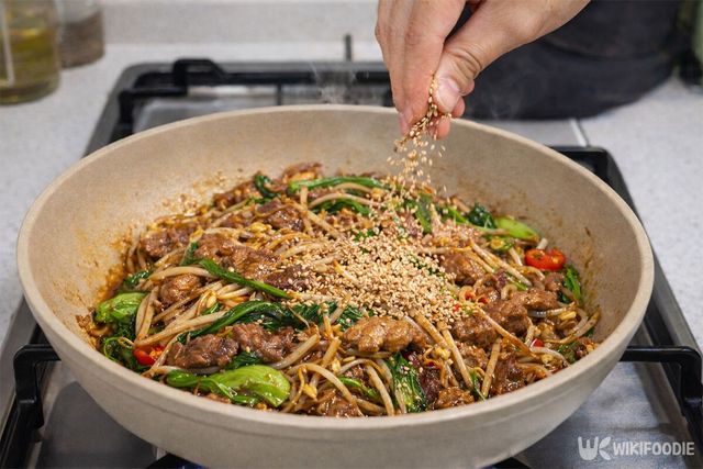 마지막으로 미리 익혀둔 우삼겹을 다시 합쳐 한 번 더 뒤섞으면 완성이다. 불을 끈 뒤 참기름과 참깨를 뿌려 마무리한다.