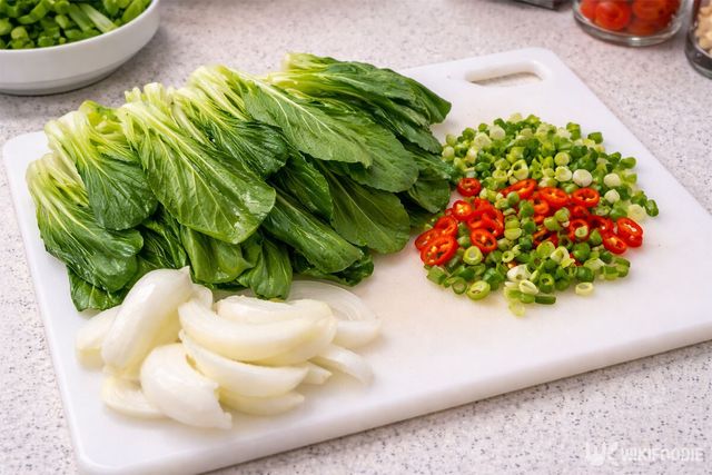 팬에 남은 고기 기름에 다진 파와 마늘을 넣고 볶으면 풍미가 깊어진다. 파기름 향이 올라올 때 양파와 청경채를 넣고 가볍게 익힌다.