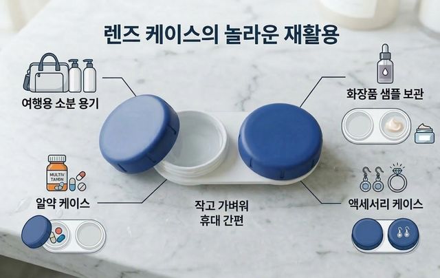 가장 활용도가 높은 방법 중 하나는 '화장품 샘플 보관용'이다. 여행이나 외출을 준비하다 보면 화장품 샘플을 여러 개 챙기게 되는데, 이미 개봉한 샘플은 휴대하기가 애매한 경우가 많다. 이때 렌즈 케이스에 내용을 덜어 담아두면 간편하게 들고 다닐 수 있다. 작은 공간이 두 칸으로 나뉘어 있어 서로 다른 제품을 나눠 담기도 쉽다. 특히 여행 중 세안 후 바를 크림이나 에센스를 소량으로 챙길 때 유용하다.