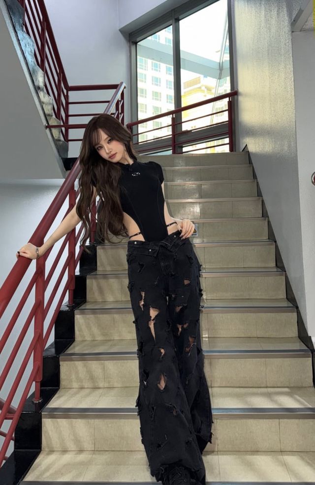 사진 속 리즈는 몸에 밀착되는 블랙 톱에 과감한 컷아웃 디테일을 더해 한줌 허리를 강조했고, 데미지 디테일이 돋보이는 와이드 팬츠로 힙한 무드를 완성했다. 상의는 과감하고 하의는 루즈하게 눌러주며 실루엣 대비를 극대화한 스타일링이 인상적이다.