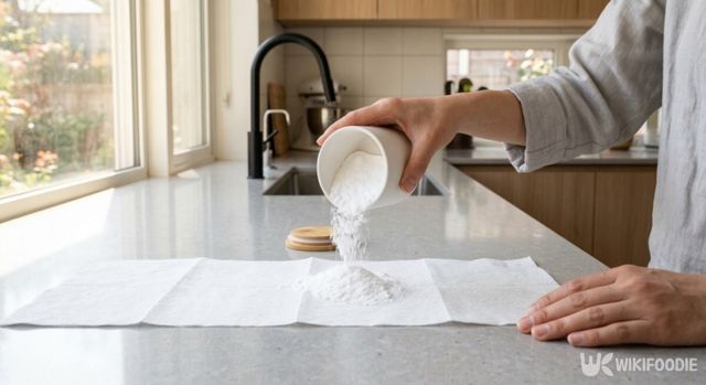다음으로 베이킹소다를 준비한 뒤 휴지 가운데에 뿌린다. 이때, 베이킹소다 양이 너무 적으면 효과가 약해질 수 있어 어느 정도 넉넉하게 넣는 것이 좋다.