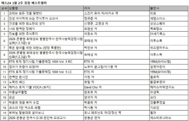 신학기 시즌을 맞아 목표 설정을 돕는 자기계발서와 수험서의 인기도 이어졌다. 구독자 36만 명을 보유한 ‘미주은’ 유튜브 채널 운영자 최철 작가의 첫 에세이 ‘노력의 배신’은 종합 13위, 자기계발 분야 1위에 올랐다. 또한 신학기 수요로 ‘2026 큰별쌤 최태성의 별별한국사 한국사능력검정시험 심화’와 ‘ETS 토익 정기시험 기출문제집’ 등이 지난주에 이어 베스트셀러 상위권을 유지했다.