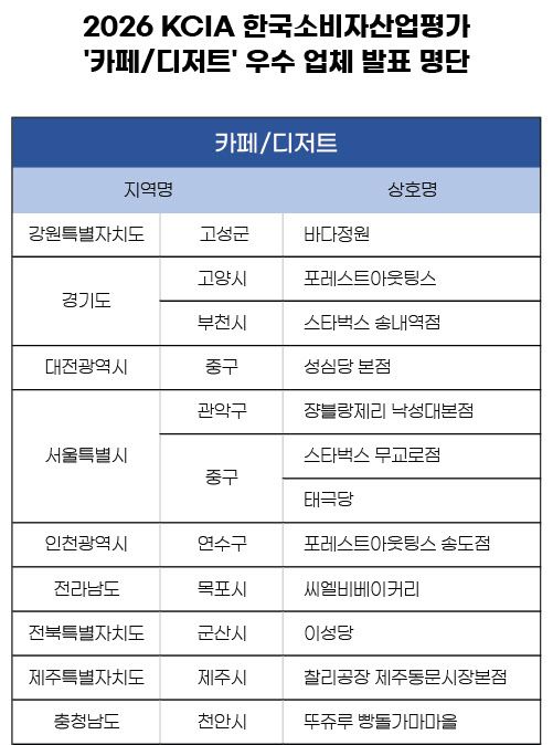 [이데일리 이윤정 기자] KCA한국소비자평가가 대한소비자협의회 주최, 한국소비자평가 주관으로 진행된 ‘2026 KCIA 한국소비자산업평가 ’카페/디저트‘’의 우수 업체 명단을 발표했다. 이번 평가는 소비자의 권리 보장과 객관적 정보 제공을 목표로 하며, 국내 카페와 디저트 산업의 질적 발전을 도모하기 위해 실제 방문 이용객의 평가를 바탕으로 우수 업체를 선정한다.