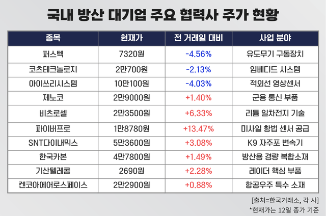 위성통신 및 군용 통신 부품 전문기업인 제노코와 미사일과 어뢰의 전원 공급원인 리튬 일차전지 분야 기술을 보유한 비츠로셀 역시 방산 대기업들의 대표적인 협력사로 꼽힌다. 이 밖에 ▲파이버프로(미사일 항법 센서 공급) ▲퍼스텍(유도탄 비행 제어) ▲SNT다이내믹스(K9 자주포 변속기) ▲한국카본(방산용 경량 복합소재) ▲기산텔레콤(레이더 핵심 부품) ▲캔코아에어로스페이스(항공우주 특수 소재) 등도 'K-방산' 특수 가능성이 점쳐지는 기업들이다.